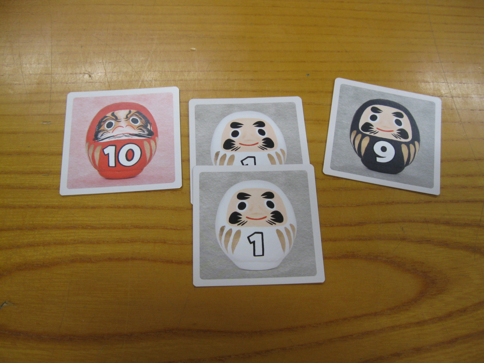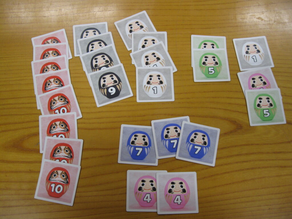 カードには数字のついただるまの絵が描かれています。プレイヤーは一枚ずつ引いていき、いつでも引くのをやめるかもう一枚引くか決めることができます。ただし、同じ数字のだるまを引いたらバーストしてカードはすべて失われます。